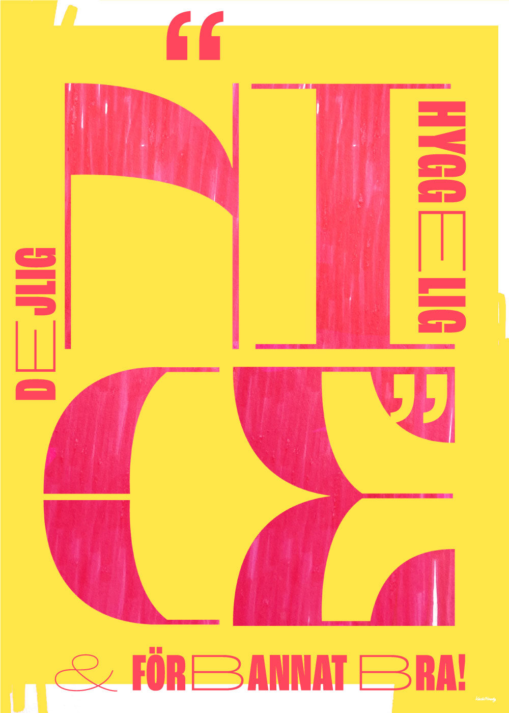 Handgjord typografi i gula och rosa färger. Fyra grundläggande geometriska figurer används för att skapa ordet "Nice".